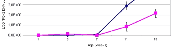Figure 1. The use of quantitative PCR for the detection of PCV2 allows the viral load of the studied animals to be established. The animals affected with PMWS (blue line) present a viral load in serum which is significantly higher than that of healthy animals (pink line).