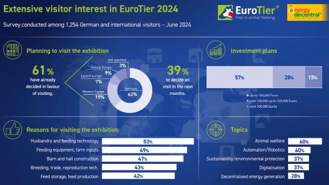 EuroTier, the world's leading trade fair for professional animal husbandry and livestock management, will take place in parallel with EnergyDecentral, the leading international trade fair for decentralised energy supply, in Hanover, Germany, from 12 to 15 November 2024. Under the guiding theme ‘We innovate animal farming’, the trade fair offers an international technical programme on the latest developments in cattle, pig and poultry production. An additional area is dedicated to horses and addresses the current issues affecting horse farms. Farming professionals will also be able to explore the topics ‘Direct farm sales and on-farm slaughter’ as well as a range of professional topics in feeding. The DLG stand offers presentations and expert talks on topics such as sustainability, animal welfare, digitalisation and the promotion of young talent in agriculture.