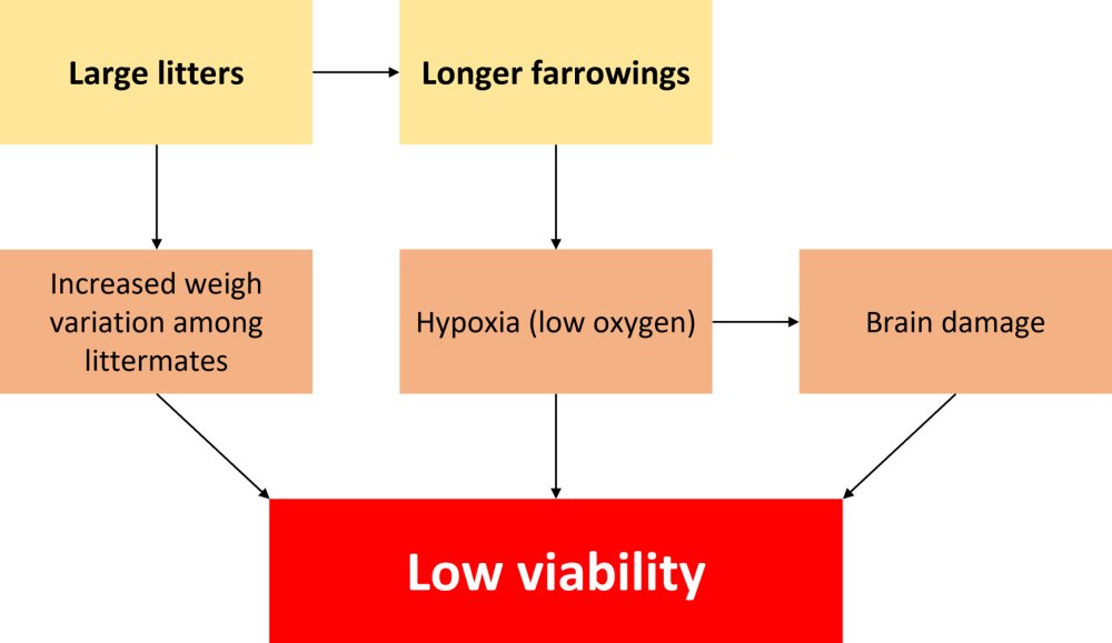 Dystocia, or difficulty during farrowing, can lead to asphyxia, hypoxia, brain damage, bleeding, and trauma, resulting in less viable piglets. The same could be said for longer farrowing.