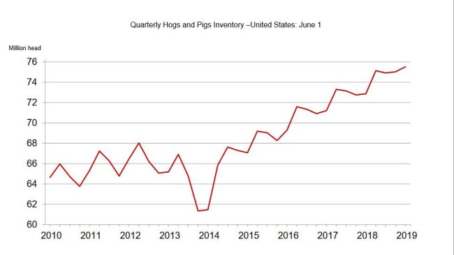 The June-August 2019 pig crop, at 35.3 million head, was up 3 percent from 2018. This is the largest June-August pig crop since estimates began in 1970.
