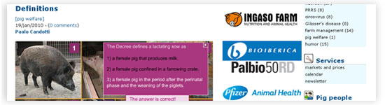 We have just added a new section, Pig welfare, to pig333, on the European legislation about the minimum standards for the protection of pigs (2001/88/EC of 23/Oct/2001 and 2001/93/EC of 9/Nov/2001). This section has an interactive format of questions and answers starting from a photograph, and has been prepared by Paolo Candotti.