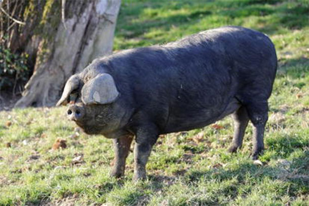 The Gascon pig breed morphology information is summarised in Table 1. The Gascon is a resistant, slow-growing breed able to live outdoors all year round. As described in the breed standard, animals have a cylindrical shape with thin and tough limbs. They have black skin and are black wire-haired with thicker hair along the dorsal stripe finishing in a swirl on the rump beside a cowlick on the top of the back. Gascon pigs face is characteristically pointed “like a mole” with narrow ears close to the base, slightly tilted over the eyes with length equal to half the length of the head (Figure 2).