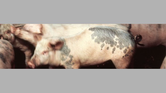 The condition results in skin lesions that look similar to ringworm. The initial skin lesions are characterized by small erythematous papules which expand to form a ring with distinct red and raised borders, creating a mosaic pattern. The centre of the lesion is usually flat and covered with brown scales overlaying normal skin. The lesions are found predominantly on the ventral abdomen and inner thighs but occasionally may be seen over other areas. It is usually seen in pigs of two to three months of age. Occasionally it is seen in suckling pigs and very rarely in pigs up to one year old. Recovery is normally spontaneous in 4 to 8 weeks.