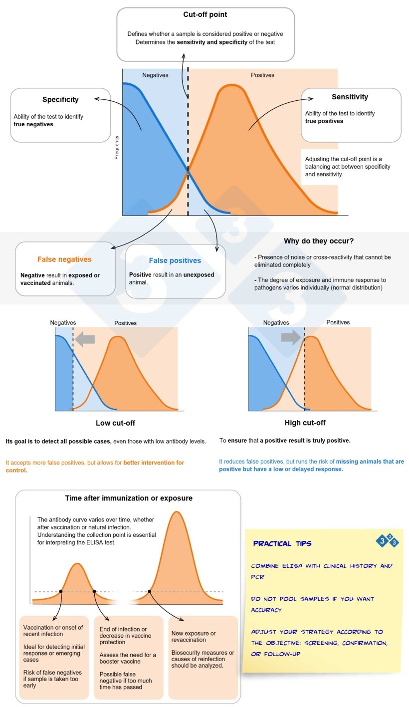 The cut-off point in ELISA tests directly influences the sensitivity and specificity of the diagnosis. Choosing a higher or lower cut-off involves a balance with a direct impact on the detection of positive or negative animals, affecting diagnoses, sanitary control strategies, and biosecurity measures.