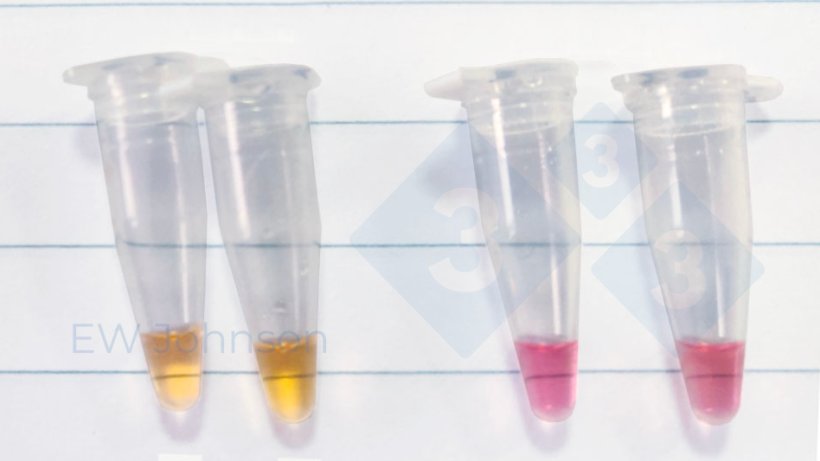 Figure 3 shows the result of a LAMP assay for African swine fever (ASF)- Tube A contained extract from the spleen of a sow that died from ASF. The high virus DNA content generates an opaque yellow colour. Tube B was an oral fluid swab with the typical lower ASF virus load from the same sow. Turbidity in the tubes A & B is evident by the obscuring of the background line. C to F are suspect and negative tubes.