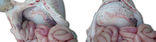 Let’s hypothesize a practical, frequent case of food competition. The fight for a portion induces the dominant animal to consume a large quantity of food in a very short period of time. This entails incomplete digestion due to insufficient acidification. This reduces the antibacterial action of hydrochloric acid in the stomach. This, added to the abundance of nutrients, stimulates the multiplication of bacteria, which produces an enormous quantity of gas, in the stomach as well as in the intestines. These gas bubbles make intestinal mobility difficult, stopping the pumping action and the progression of the food. This stagnation produces even more gas. The elevated pressure due to gas can produce lesions in the intestinal wall, or even displace the stomach or intestine upwards. The pressure exerted on the abdominal organs can involve vascular obstruction, slowing down blood circulation or compressing the thoracic cavity, producing dyspnea (see image). Death is quick due to circulatory collapse, or respiratory insufficiency. If this sequence of facts is plausible, competition at the trough, as well as feed contamination, play a key role. Summer temperatures as well as some particularly fermentable ingredients can worsen the situation.