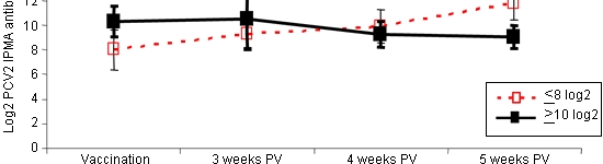 Figure 1. Profile of PCV2 IPMA antibody titres of a group of PCV2 vaccinated pigs at 3 weeks of age (single dose), and monitorization of antibody response at 3, 4 and 5 weeks post-vaccination (PV). Pigs were divided based on antibody titres at vaccination time: those with mean IPMA antibody titres ≤8 log2 and those with ≥10 log2 (adapted from Fort et al., 2009, Vaccine, 27: 4031–4037).