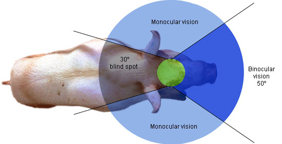 Pigs have a panoramic vision of 310º and binocular vision of 35-50º (Fig. 1). This means that compared to humans, pigs prioritise their lateral monocular vision and this increases their panoramic vision (greater capacity for detecting possible danger, food, other pigs, etc) and decreases their bifocal vision (greater difficulty for calculating distances). Therefore, when it is necessary to manage the pig in a holding pen, this lateral vision of the world should be taken into account since an opening at the side of the chute may not seem important to us (as we have frontal vision), but the pig is going to find it at the centre of its visual field. This can sometimes lead to the pig trying to escape through small gaps which we had not thought to be a problem. It is therefore adviseable to make sure that the chutes are completely closed at the sides to stop the animals from being distracted or startled by any other stimulus aside from the actual handling.