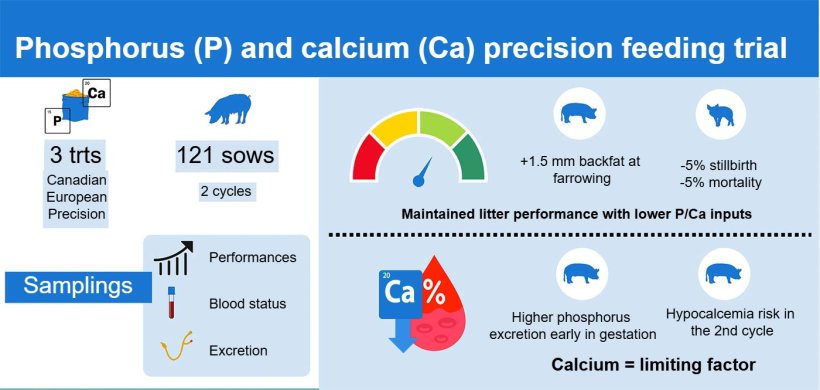 Another strategic line has been the precision feeding of nutrients such as phosphorus and calcium evaluated through serology and urine excretion, evaluated in 121 sows over two cycles. The trials confirm that it is possible to maintain litter performance with lower P and Ca intakes, increasing backfat thickness at farrowing (+1.5 mm) and reducing both stillbirths and mortality by 5%. However, the results also show that calcium can become a limiting factor, especially in the second reproductive cycle, with a risk of hypocalcemia if the transition to farrowing is not managed properly.