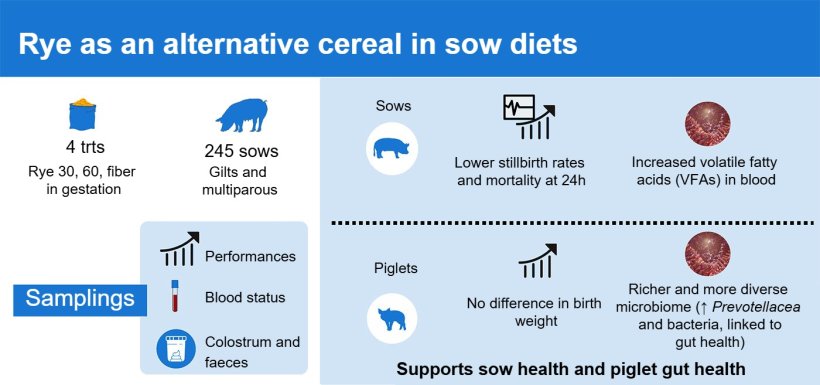 The CDPQ has also explored alternatives to traditional grains, such as using rye in gestation diets. In trials with 245 sows, rye has proven to be a viable option from a productive and health standpoint, associated with lower rates of stillbirths and mortality in the first 24 hours, with no negative effects on birth weight. In addition, higher concentrations of volatile fatty acids were observed in the blood, as well as a richer and more diverse intestinal microbiome in piglets, pointing to potential benefits for digestive health.