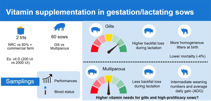 Vitamin supplementation during gestation and lactation has been another important focus of research. In studies with 60 sows, comparing NRC recommendations with levels increased by 50% (e.g., comparing 200 international units of vitamin D recommended by the NRC with 2000 UI), more homogeneous litters at birth and a 4% reduction in mortality in gilts were observed. The results suggest that the vitamin requirements of gilts and highly prolific sows may be underestimated, especially in situations with high metabolic demand, although there are different effects on the mobilization of body reserves during lactation.