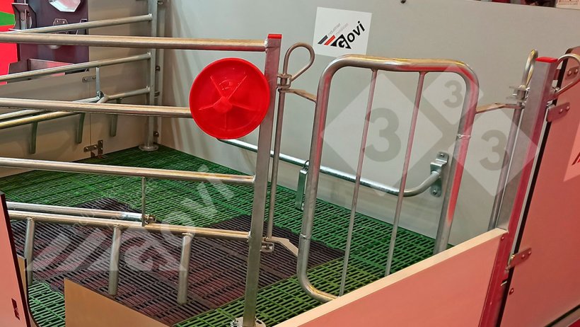 With this set-up, each piglet feeder is placed on the mount that has been installed in each farrowing pen. Hanging the feeder vertically offers the advantage of making it much easier to clean and dry.