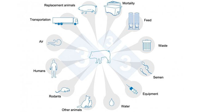 3. We have not understood the importance of establishing, adhering to, and continuously auditing an effective, non-psychological biosecurity program. PRRS virus has at least 12 transmission routes that vary in importance depending on the complexity and location of the system (Figure 1). As illustrated in the following equation, and well known to all of us, biosecurity is complex. Unfortunately, in many swine production systems, the cost of its implementation and maintenance is still considered an expense and not an investment. Not having an effective biosecurity program allows for continuous recontamination, both externally and internally, of susceptible populations in the herd.