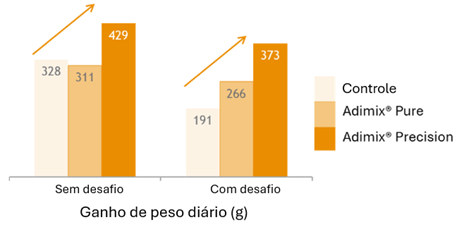 Para comprovar o conceito de butirato de liberação precisa, a Adisseo conduziu um experimento na Universidade de Bolonha. Os resultados mostraram que o butirato não revestido (Adimix® Pure) e o butirato revestido de liberação precisa (Adimix® Precision) reduziram pela metade a mortalidade em leitões desmamados desafiados com E. coli, como mostra a Figura 1. No entanto, o revestimento de alta qualidade do Adimix® Precision foi necessário para maximizar o efeito no ganho médio diário e na morfologia das vilosidades intestinais, o que provavelmente melhora a digestão e absorção, reduzindo o risco de diarreia.