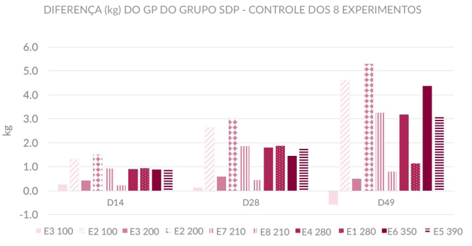 Na Granja 1, o peso no dia 0 (3,30 kg; 3,58 kg), o peso no dia 14 (5,44 kg; 5,46 kg) e o consumo médio diário de ração (177,5 g/dia; 177,5 g/dia) não diferiram entre os grupos SDP e Controle. Porém, o ganho médio diário de peso (SDP, 152,3 g/dia; Controle, 133,1 g/dia) e a Conversão Alimentar (SDP, 1,17; Controle, 1,34) melhoraram (P<0,05) no grupo SDP.