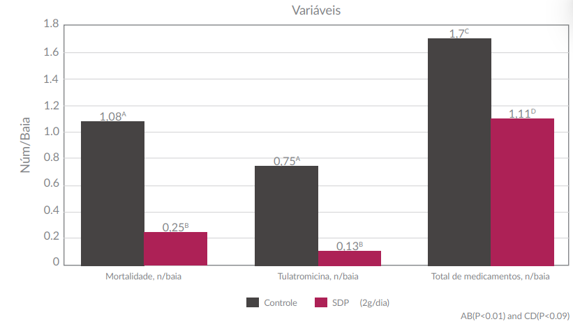 Um total de 1.536 suínos em crescimento (65 dias de idade) foram distribuídos em 24 baias de machos castrados e 24 baias de fêmeas (32 suínos/baia). Os suínos foram distribuídos aleatoriamente em um grupo controle ou em um grupo com SDP (24 repetições/tratamento). Ambos os grupos apresentaram o mesmo status sanitário, ração e programa vacinal. O grupo SDPrecebeu 2 g de SDP aplicados sobre a ração diariamente durante a fase de crescimento e terminação, de 98 dias. A cada dia, 64 gde SDP foram adicionados ao cocho e misturados manualmente à ração de cada baia com 32 animais, fornecendo assim 2 gde SDP por suíno. Mortalidade e uso de medicamentos foram registrados por baia ao longo do estudo. A baia foi considerada unidade experimental, e os dados foram analisados usando um modelo misto para os efeitos principais de tratamento esexo, com a repetição como efeito aleatório. Probabilidadesde qui-quadrado foram relatadas para os resultados expressos em porcentagem.