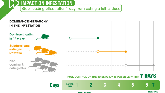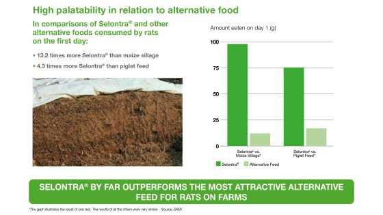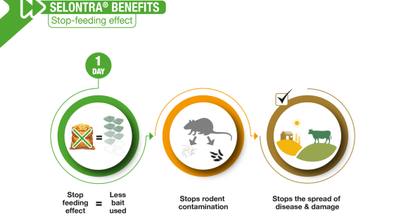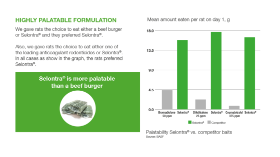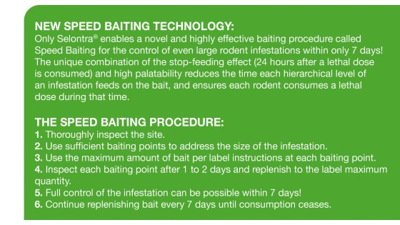 Thanks to its unique mode of action and the extremely palatable bait, Selontra® enables you to achieve complete control of even large rodent infestations within as few as 7 days.