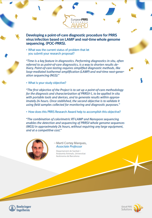 The independent European PRRS Research Award review board is chaired by Enric Mateu (Universidad Autònoma de Barcelona) with members from across swine practice and academia: Julia Stadler (LMU Munich), Nicolai Weber (Danish Agriculture & Food Council), Giovanbattista Danilo Guadagnini (VetEvolution), Michele Drigo (University of Padova), Carles Vilalta (IRTA-CReSA) and Torsten Pabst (Tierarztpraxis Dr. Pabst).