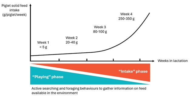 As piglets mature, their feeding behaviour gradually transitions into an “intake” phase. At this stage, the emphasis shifts from exploration to actual consumption, as piglets increasingly rely on solid feed to meet their nutritional requirements in addition to sow milk. This progression has been demonstrated in several studies (Figure 1), which show that solid feed intake increases as sow milk production declines (more weeks into lactation).