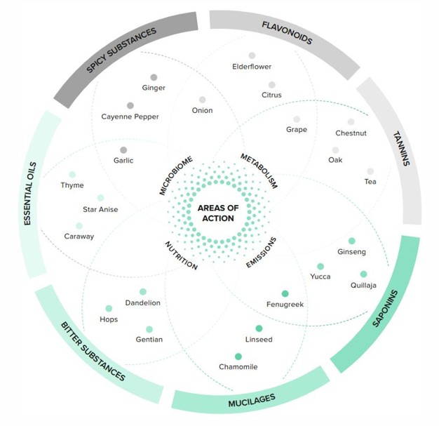Figure 1 - Phytogenics comprise a diverse range of bioactive compounds with multiple modes of actions.