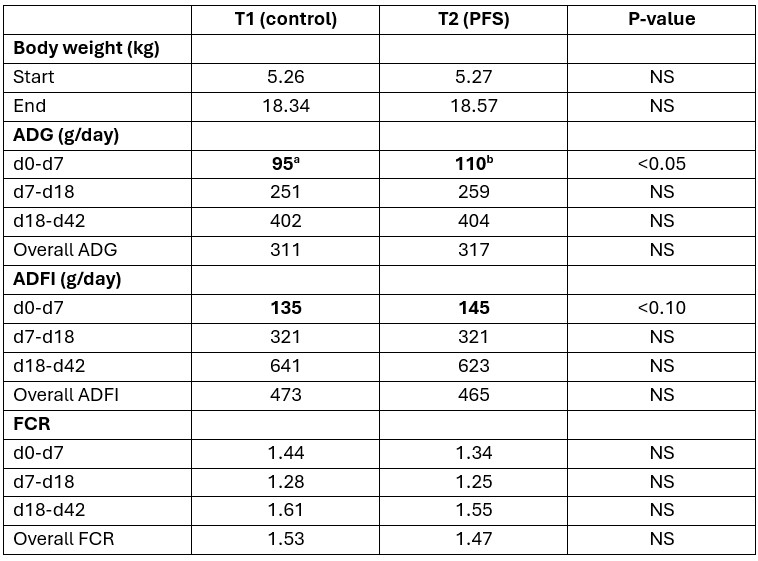 During the first 7 days post-weaning, the PFS group showed a trend for improved feed intake and a significant improvement in ADG by 15.1% (110 vs 95 g/day, p-value, see Table 2).