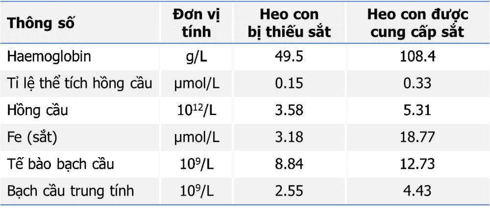 Nghiên cứu của Svoboda (2004) trên heo con 21 ngày tuổi cho thấy ảnh hưởng của vấn đề thiếu sắt tác động đến hệ miễn dịch: sụt giảm tế bào bạch cầu và số lượng bạch cầu trung tính. Nhóm heo con bị thiếu sắt cũng giảm rõ rệt trên chỉ số hồng cầu và huyết sắt tố (3.58 và 49.5 so với 5.31 và 108.4). Nghiên cứu cũng cho thấy sự khác biệt khi so sánh thể trọng lúc 21 và 35 ngày tuổi tương ứng là 0.49kg (7.27kg / 6.78kg) và 2.8kg (12.2kg / 10.73kg).