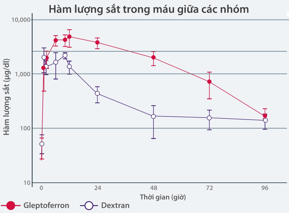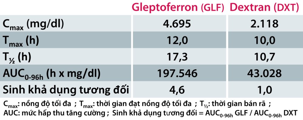 Nghiên cứu của (Morales, 2018) cho thấy khả năng vượt trội của Gleptoferron so với Sắt-dextran: nồng độ cao nhất (Cmax) cao gấp 2.2 lần và sinh khả dụng cao gấp 4.6 lần.