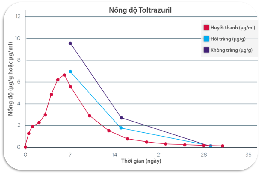 Toltrazuril (TZR) được xem là giải pháp hiệu quả kiểm soát bệnh cầu trùng trên heo con, phần lớn dùng qua đường uống. Totrazuril sau khi hấp thu sẽ chuyển hóa ở dạng Toltrazuril Sulfoxide (TZR-SO) và nhanh chóng chuyển sang Toltrazuril Sulfon (TZR-SO2). TZR-SO2 có thời gian bán hủy rất lâu, hơn 200 giờ (Lim, 2010). Cả hai dạng chuyển hóa của TZR đều có tác động hiệu quả chống cầu trùng giai đoạn bên trong vật chủ.