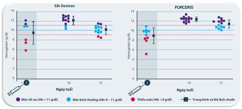 Theo Daniel Sperling và cộng sự (2018), nghiên cứu so sánh FORCERIS với nhóm đối chứng (tiêm sắt Uniferon và uống Toltrazuril), kết quả cho thấy: Không có heo bị thiếu máu ở nhóm FORCERIS.