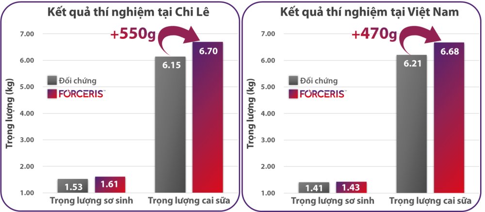 Thí nghiệm so sánh trọng lượng cai sữa cho thấy sự khác biệt có ý nghĩa giữa nhóm FORCERIS và nhóm đối chứng: