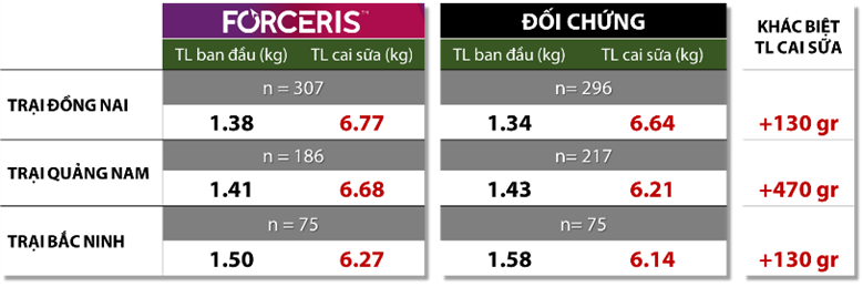 Kết quả so sánh sự khác nhau về trọng lượng cai sữa. Nhóm được tiêm FORCERIS có TLCS tốt hơn từ 130 đến 470 gram/con, sự khác biệt có ý nghĩa ở trại Quảng Nam (470 gr/con, với p<0.05).
