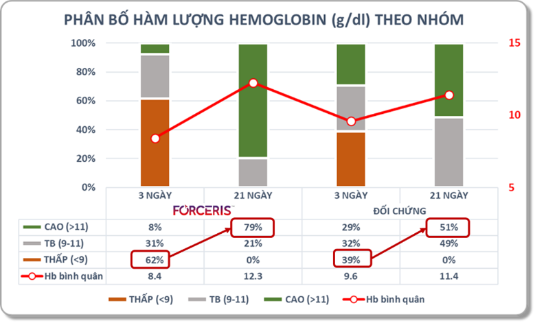 Heo con 3 ngày tuổi cho thấy tỉ lệ thiếu máu lâm sàng khá cao: 62% ở nhóm chưa tiêm FORCERIS, 39% ở nhóm đối chứng. Đây là tình trạng thiếu máu trước khi điều trị dự phòng, kết quả cải thiện sau đó tại thời điểm 21 ngày tuổi có khác biệt rõ rệt: nhóm tiêm FORCERIS có 79% heo con có Hb tối ưu, cao hơn nhiều so với nhóm đối chứng (51%), mặc dù nhóm heo tiêm FORCERIS có chỉ số Hb ban đầu thấp hơn (8.4 so với 11.4 g/dl).