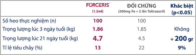 Qua đó cho thấy, mặc dù trại thí nghiệm có nguy cơ cao về tiêu chảy do cầu trùng và các bệnh đường tiêu hóa khác, trại có tình trạng thiếu máu lâm sàng khá cao (39-62%) ở nhóm thí nghiệm, FORCERIS vẫn đem lại hiệu quả tốt hơn so với nhóm đối chứng (điều trị dự phòng theo quy trình của trại).