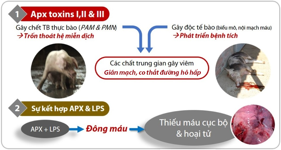 Yếu tố quyết định giúp A.p tồn tại và hủy hoại mô là ngoại độc tố Apx (Bossé, 2002). ApxI và ApxIII có tính gây độc tế bào cao, trong khi ApxII có tính độc trung bình đối với đại thực bào và các tế bào đa nhân.