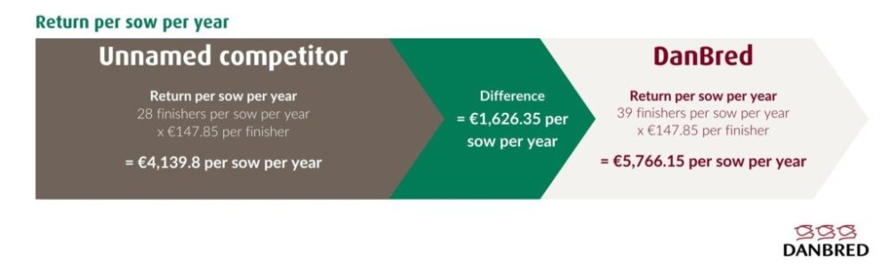 That means, even if you had to spend an unrealistic 0 hours of work taking care of the animals from the unnamed competitor it does not matter, because the return cannot compare to the total return of EUR 5,524 per sow per year with DanBred genetics.