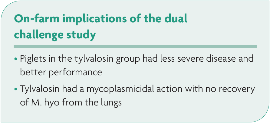In the dual challenge study, piglets were challenged with M. hyo on days zero, one and two, and with PRRSV-2 on day 14. Cytokines, viremia, bacteriology and lung lesions were evaluated.