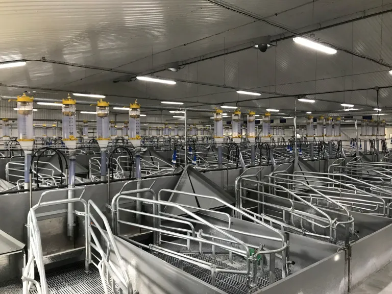Sistemas de llenado: Los sistemas de llenado para un tipo de alimento son sistemas de alimentación básicos y fáciles de operar. Estos sistemas pueden equiparse con caídas de alimento simples y robustas para lechones y cerdos de engorde. Para cerdas, están equipados con comederos redondos EasyFeed o Daltec. Con los dispensadores redondos, llega hasta una cantidad de dosificación mínima de 0,25 l. Esta es una ventaja en la construcción de partos.