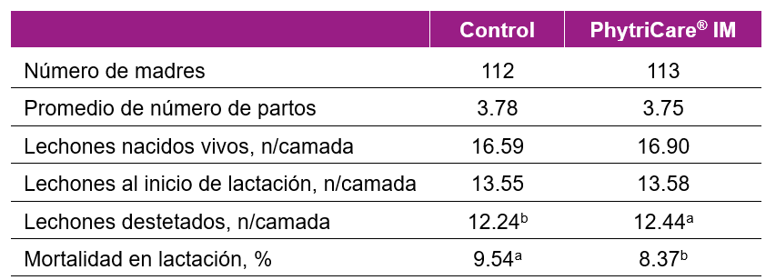 En un ensayo realizado en España se demostró una mejora significativa en la salud y productividad de las cerdas alimentadas con PhytriCare® IM. Se observó un incremento de 0,2 lechones destetados por cerda y ciclo, así como una notable reducción en la mortalidad de los lechones. Además, se reportaron menores costos de medicación y una disminución en la tasa de descarte de las cerdas, lo que resultó en un aumento de rentabilidad del 1,9% y un retorno de inversión estimado en 9,6.