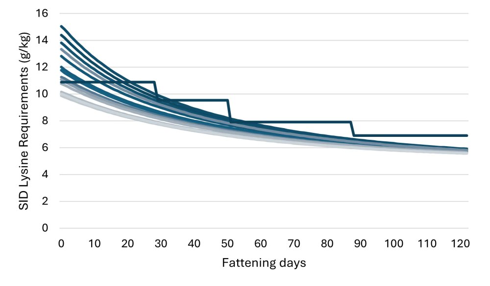 Figura 1. Ilustração das exigências de lisina SID (g/kg) dentro de uma mesma baia (linhas lineares) em comparação com a lisina SID fornecida por um programa tradicional de alimentação em quatro fases.