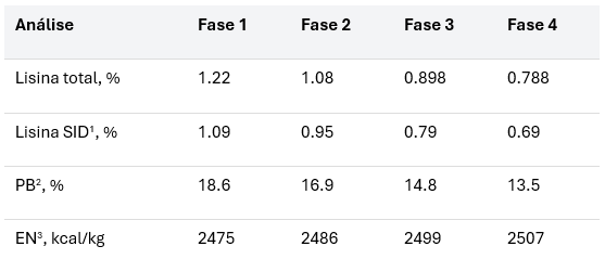 Enquanto isso, o grupo Controle seguiu uma abordagem mais tradicional. Os suínos receberam um programa padrão de alimentação em quatro fases, criado a partir da mistura de proporções fixas das mesmas rações de baixo e alto teor de lisina utilizadas anteriormente. A Tabela 1 apresenta as especificações das quatro dietas fornecidas.