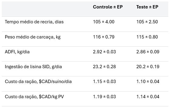 Como mostrado na Tabela 2, o desempenho de crescimento foi comparável entre os tratamentos ao longo do período de 105 dias, com tempo de criação e peso de carcaça semelhantes. O consumo de ração foi ligeiramente menor no grupo Teste, e a estratégia de mistura reduziu a ingestão estimada de lisina SID em 12,9% em comparação com o programa padrão de quatro fases.