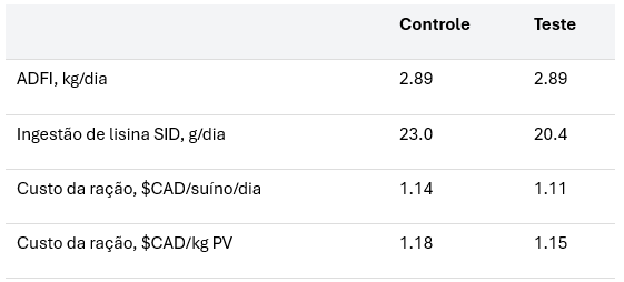 Essa redução na ingestão de lisina SID se traduziu em economia real. O custo de alimentação diminuiu em 0,05 $ CAD (≈ 0,04 $ US) por suíno por dia no grupo Teste em comparação com o grupo Controle. Quando expresso por quilograma de peso vivo (PV), isso representa 1,14 $ CAD por kg de PV (≈ 0,37 $ US/lb) para o grupo Teste, contra 1,19 $ CAD por kg de PV (≈ 0,39 $ US/lb) para o grupo Controle. Ao longo de um período completo de 105 dias, a mistura de rações resultou em um benefício total de 5,25 $ CAD por suíno (≈ 3,83 $ US).