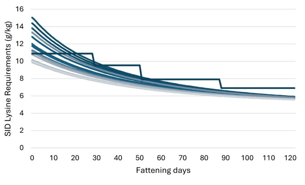 Figure 1. Illustration of SID lysine requirements (g/kg) within a pen (linear lines) compared to SID lysine received from a traditional four-phase feeding program