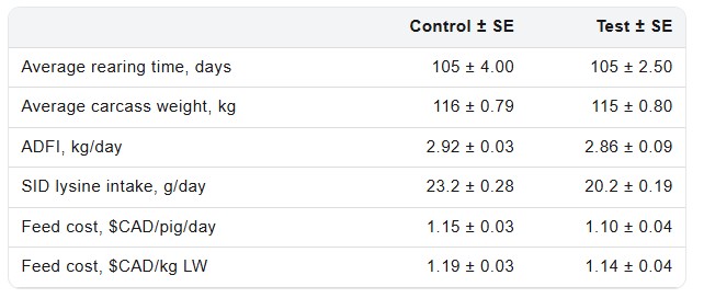 Under this standardized scenario, the Test group still achieved an advantage of 0.03$CAD per pig per day (0.02$USD) compared with the Control group. Over the full 105-day rearing period, this represents total savings of 3.15 $CAD per pig (2.30$USD).