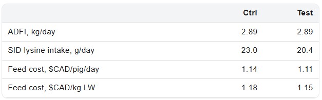 Table 3. Economic outcomes recalculated under equal feed intake (ADFI = 2.89 kg/day) for both treatments.