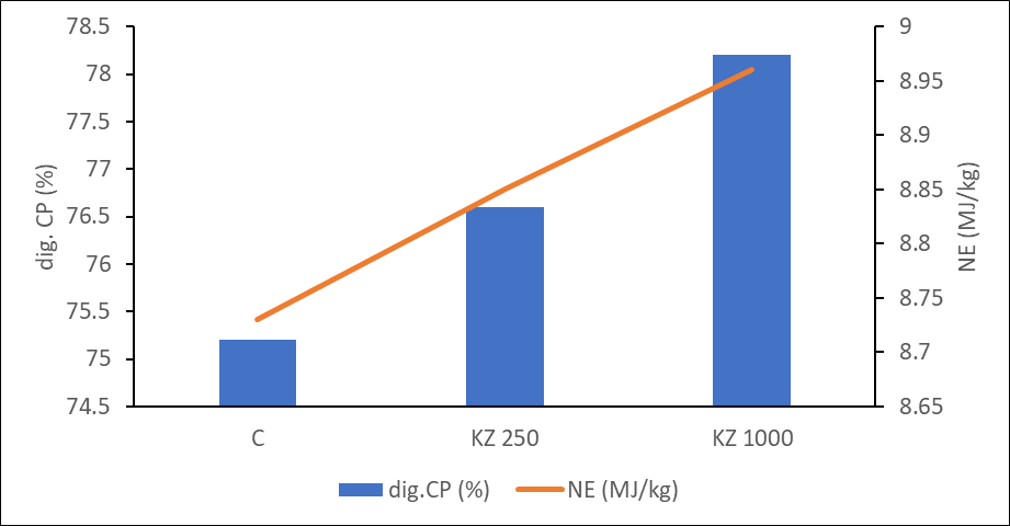 Fig. 1. Effect of protease-amylase complex (KZ) dietary supplementation in crude protein (CP) digestibility and net energy (NE) of weaned piglets.
