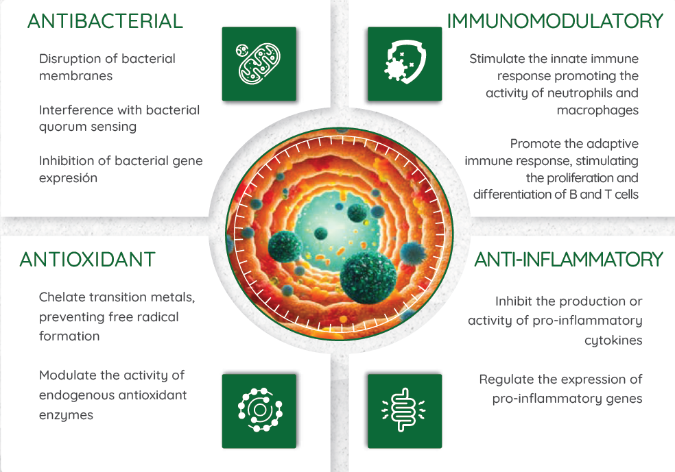 A specific combination of highly concentrated essential oils, microencapsulated with antibacterial and anti-inflammatory properties, that improve intestinal health and enhance productive performance.