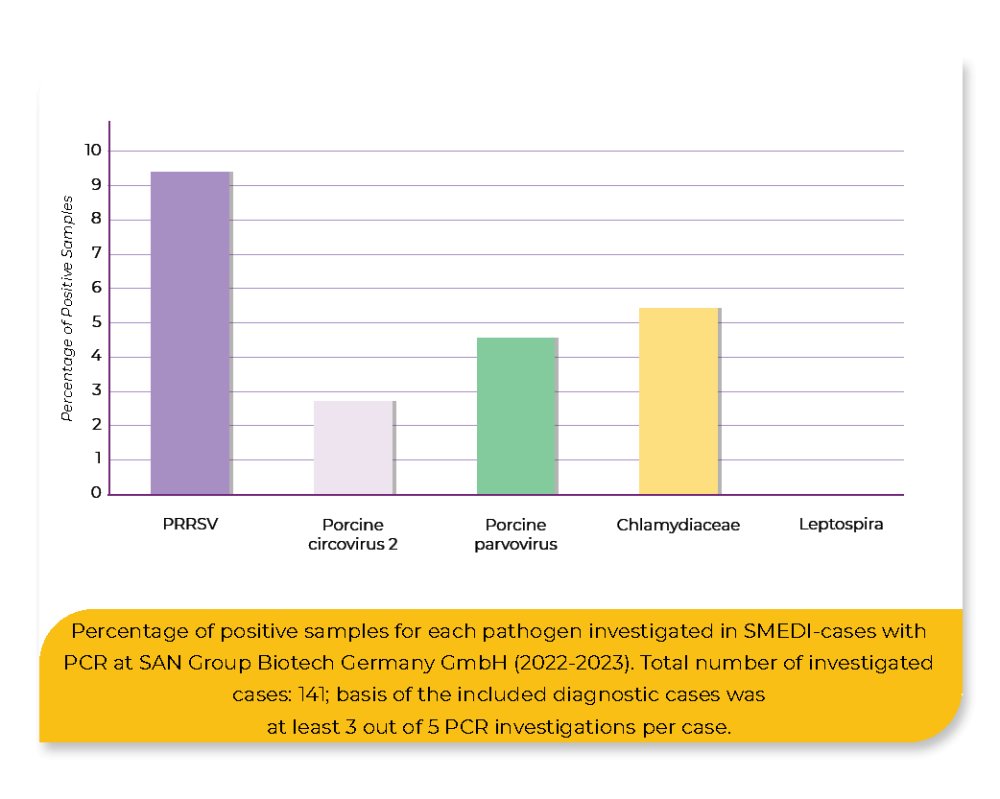 A retrospective analysis was conducted by analyzing 141 cases of submitted fetal tissue and/or placenta collected from routine diagnostics in 2022 and 2023 at SAN Group Biotech Germany GmbH. All samples had previously been screened with real-time PCR for at least three of the following pathogens: Porcine Parvovirus (PPV; 114 investigations; KYLT PPV), Porcine Reproductive and Respiratory Syndrome Virus (PRRSV; 141 investigations; LSI VetMAXTM PRRSV EU/NA), Porcine Circovirus 2 (PCV-2; 127 investigations; KYLT PCV-2), Chlamydia spp. (93 investigations; KYLT Chlamydiaceae Screening) and Leptospira spp. (118 investigations; KYLT pathogenic Leptospira).