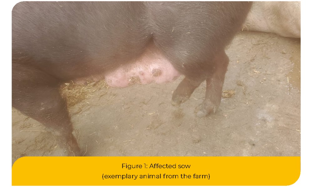 The case involved three sows from a free-range organic farm with 192 sows and extensive piglet-rearing facilities. The farm adheres in accordance with Regulation (EU) 2018/848 on organic production, using straw bedding and practicing vaccination protocols but without routine antibiotics. Necropsy was performed on affected sows, revealing extensive mastitis. Tissue samples underwent bacteriological analysis, conducted in the laboratory of SAN Group Biotech Germany GmbH, Hoeltinghausen, Germany. A histopathological examination was conducted at the IVD GmbH, Seelze-Letter, Germany.