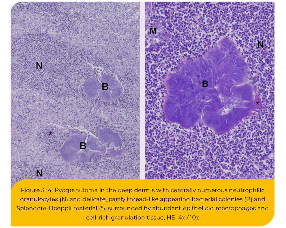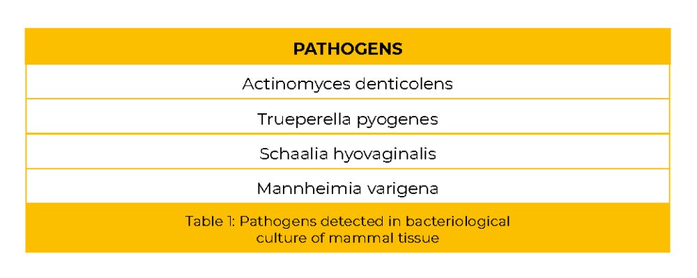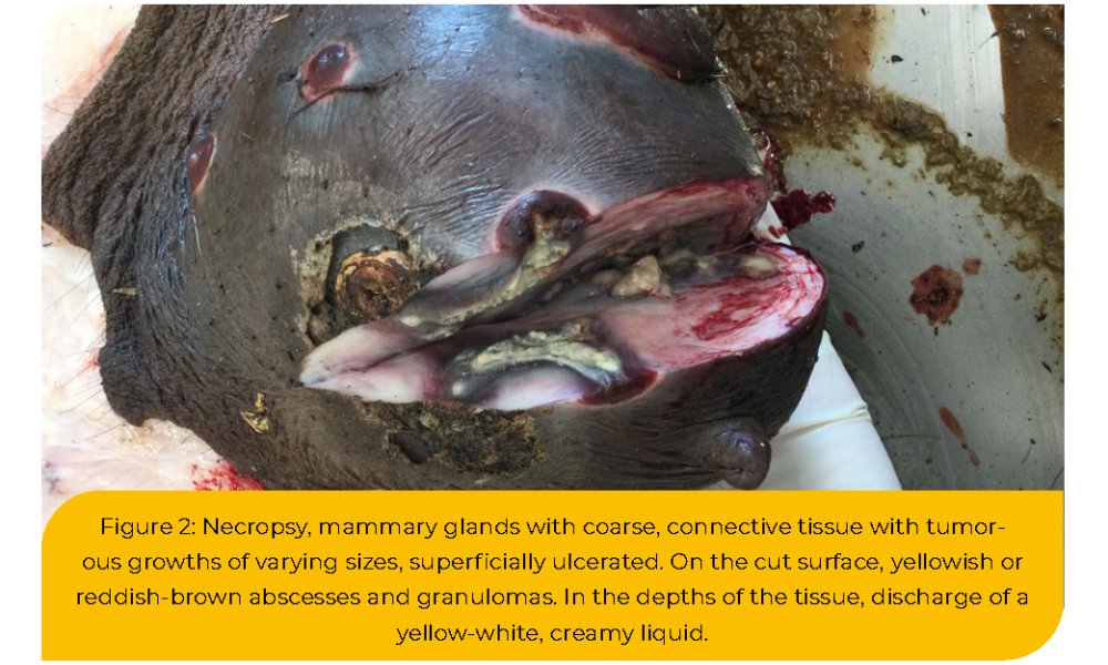 Necropsy findings indicated severe mastitis characterized by ulcerated pyogranulomatous dermatitis and extensive connective tissue proliferation. Histological analysis revealed pyogranulomas, Splendore-Hoeppli material, and bacterial colonies. Bacteriological cultures identified various Actinomyces species and related bacteria, including Schaalia hyovaginalis and Trueperella pyogenes. These results confirmed actinomycosis as the primary cause of lesions, consistent with previous reports on this condition.